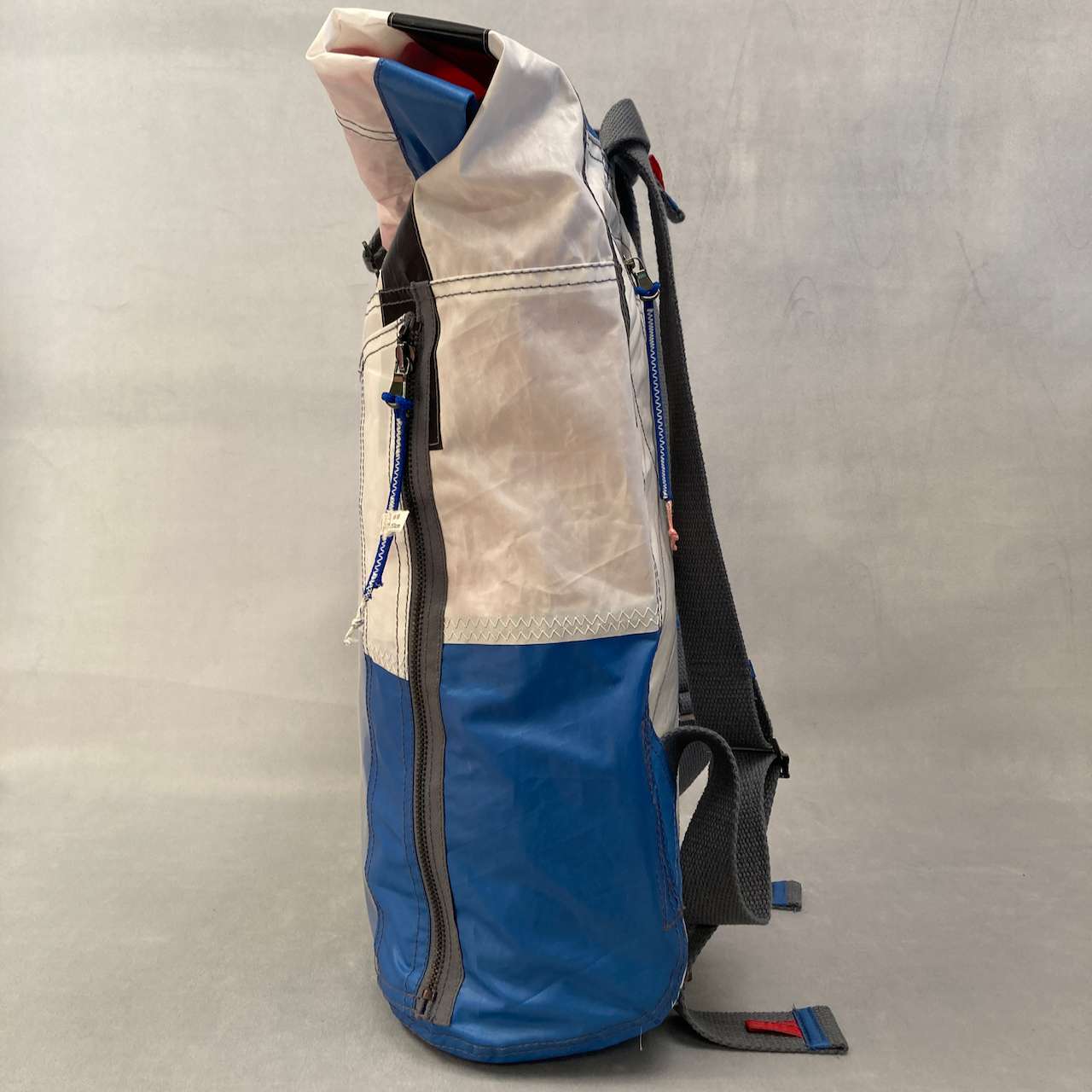 Sehr leichter, individueller und extrem gerรคumiger Rucksack. Schultergurte stufenlos einstellbar. Bequeme Handschlaufe. Auรen groรes Front-Fach mit Reiรverschluss. Am Rรผcken ein kleineres Reiรverschluss-Fach. Zusรคtzliche Rรผcken-Versteifung durch upgecycelte Bootssegel. Im Inneren ein Dreier-Steckfach sowie Dreiteilung des Hauptfachs. Ein Metall-Hook verschlieรt das Rolltop.