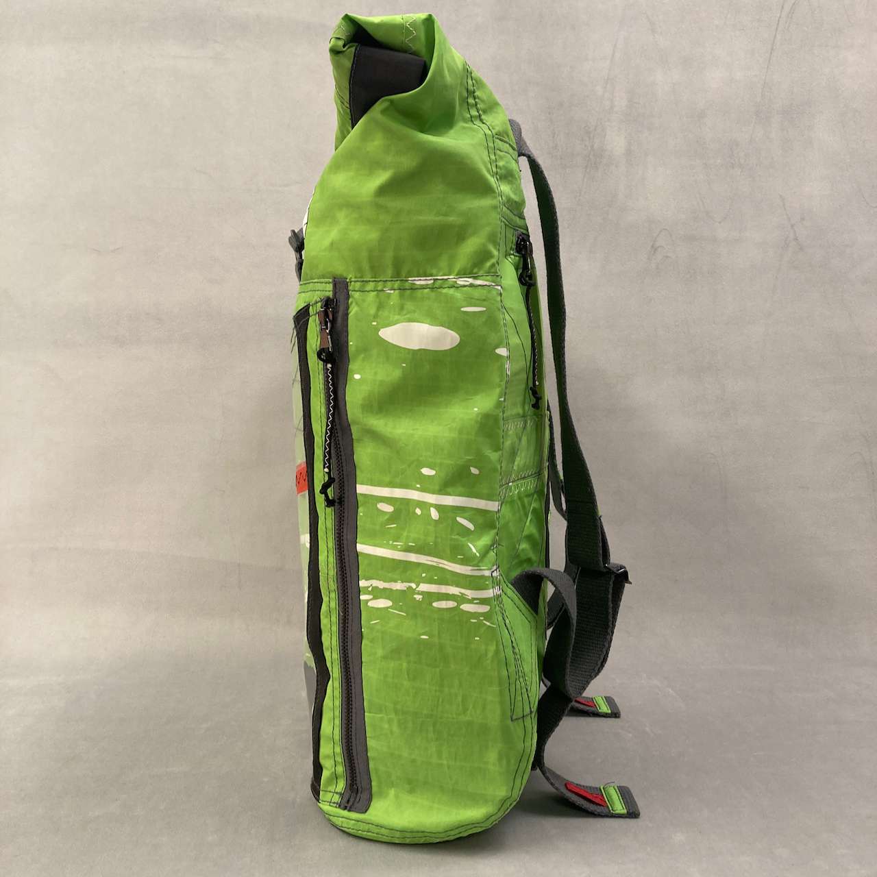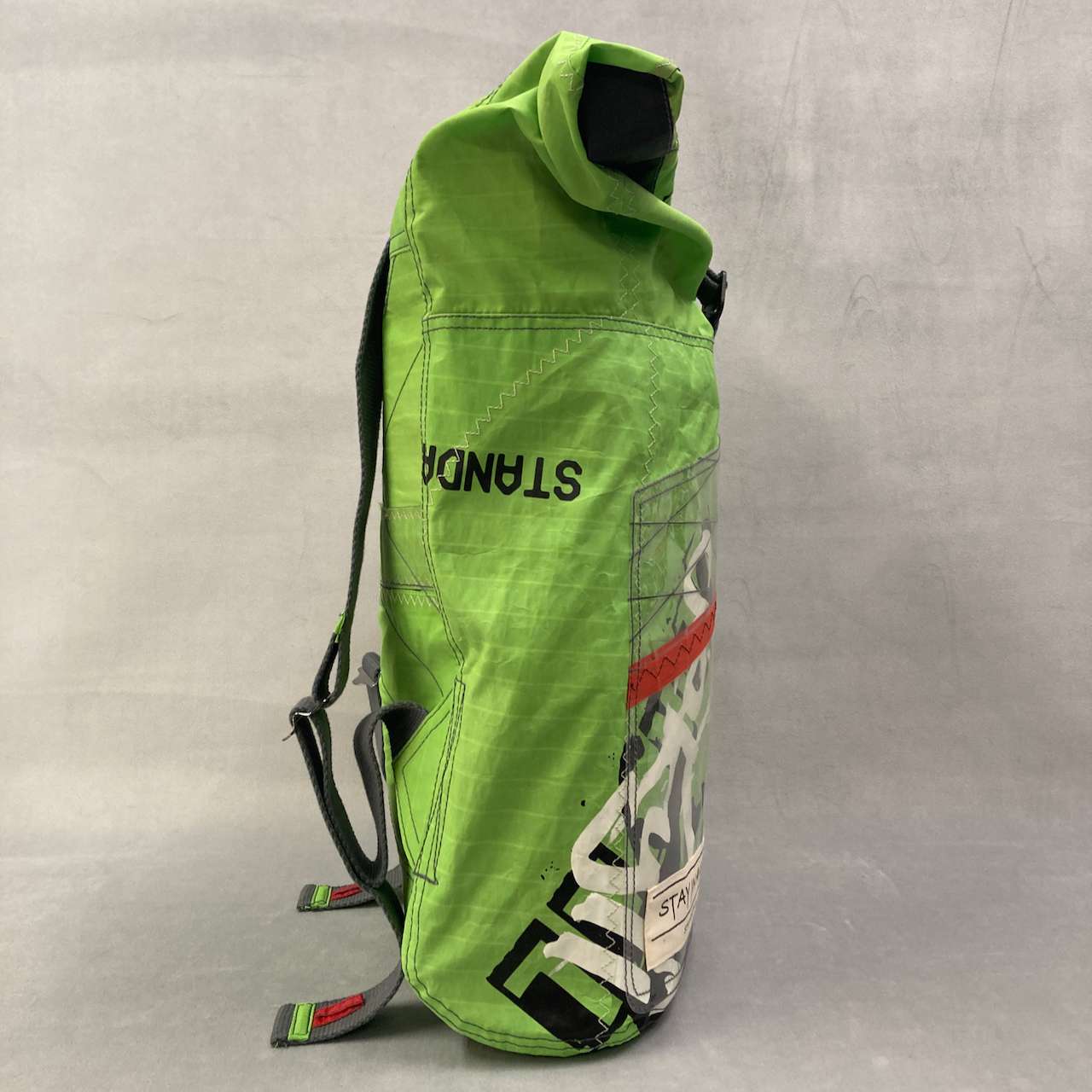 Sehr leichter, individueller und extrem gerรคumiger Rucksack. Schultergurte stufenlos einstellbar. Bequeme Handschlaufe. Auรen groรes Front-Fach mit Reiรverschluss. Am Rรผcken ein kleineres Reiรverschluss-Fach. Zusรคtzliche Rรผcken-Versteifung durch upgecycelte Bootssegel. Im Inneren ein Dreier-Steckfach sowie Dreiteilung des Hauptfachs. Ein Metall-Hook verschlieรt das Rolltop.