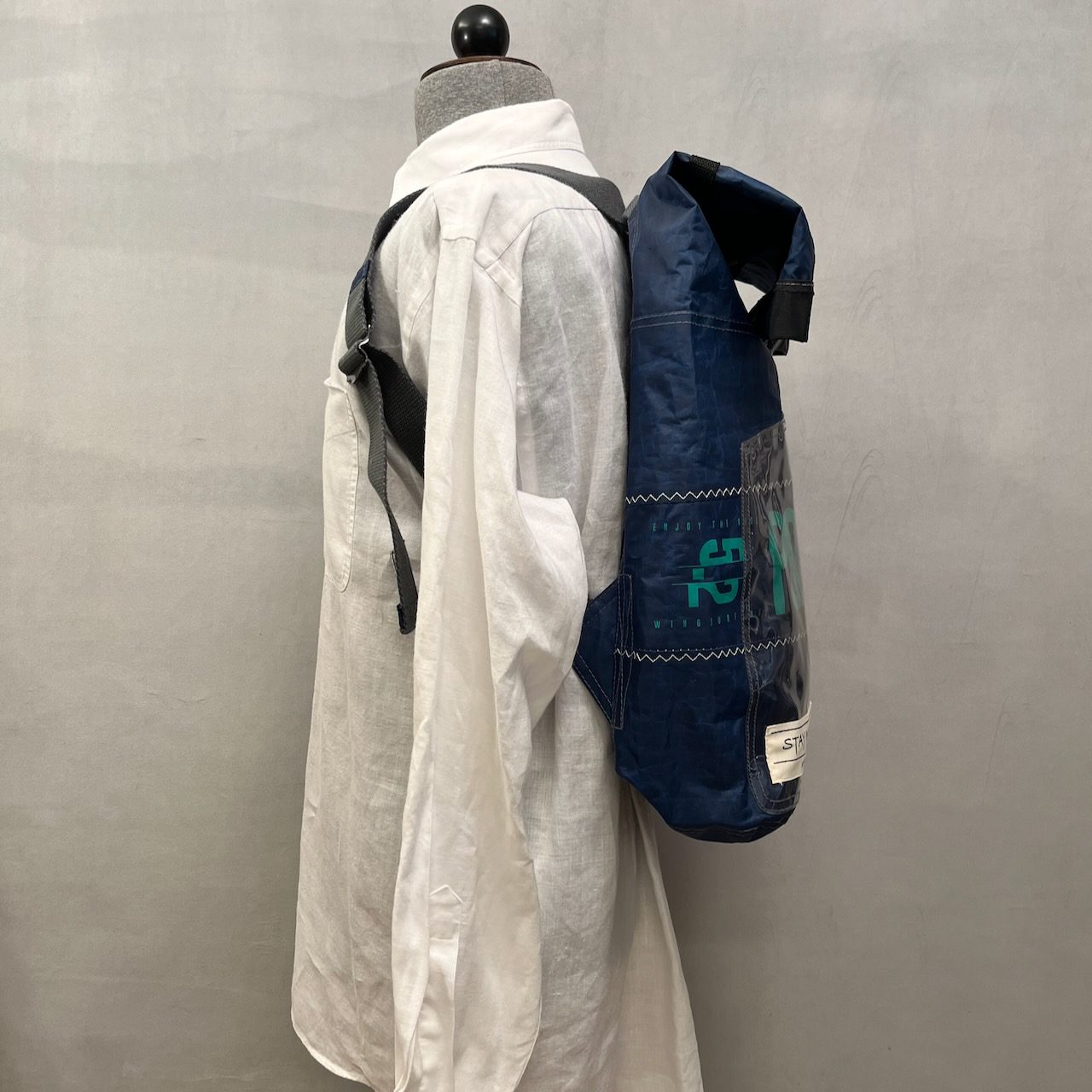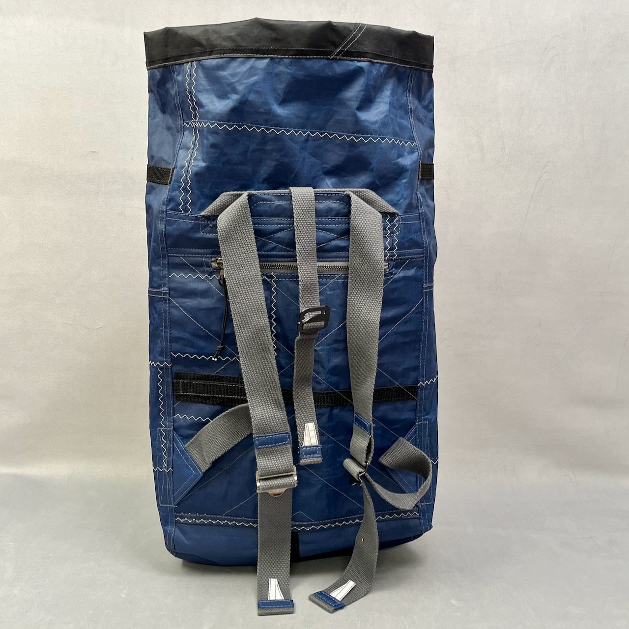 Sehr leichter, individueller und extrem geräumiger Rucksack. Schultergurte stufenlos einstellbar. Bequeme Handschlaufe. Außen großes Front-Fach mit Reißverschluss. Am Rücken ein kleineres Reißverschluss-Fach. Zusätzliche Rücken-Versteifung durch upgecycelte Bootssegel. Im Inneren ein Dreier-Steckfach sowie Dreiteilung des Hauptfachs. Ein Metall-Hook verschließt das Rolltop.