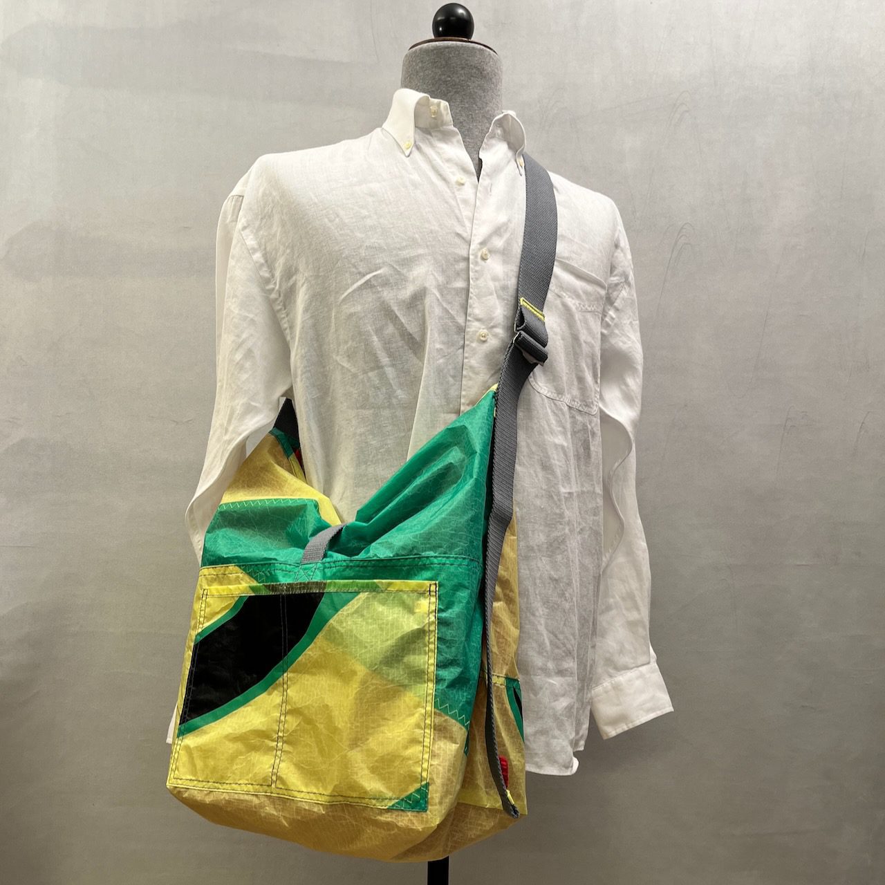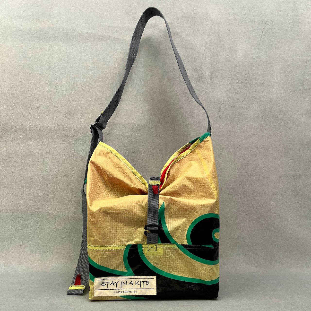Umweltfreundliche und nachhaltige Upcycling Tasche aus recyceltem Material. Jede dieser extrem leichten, handgefertigten Handtaschen wurde aus gebrauchten Kite-Surf-Segeln hergestellt.ย