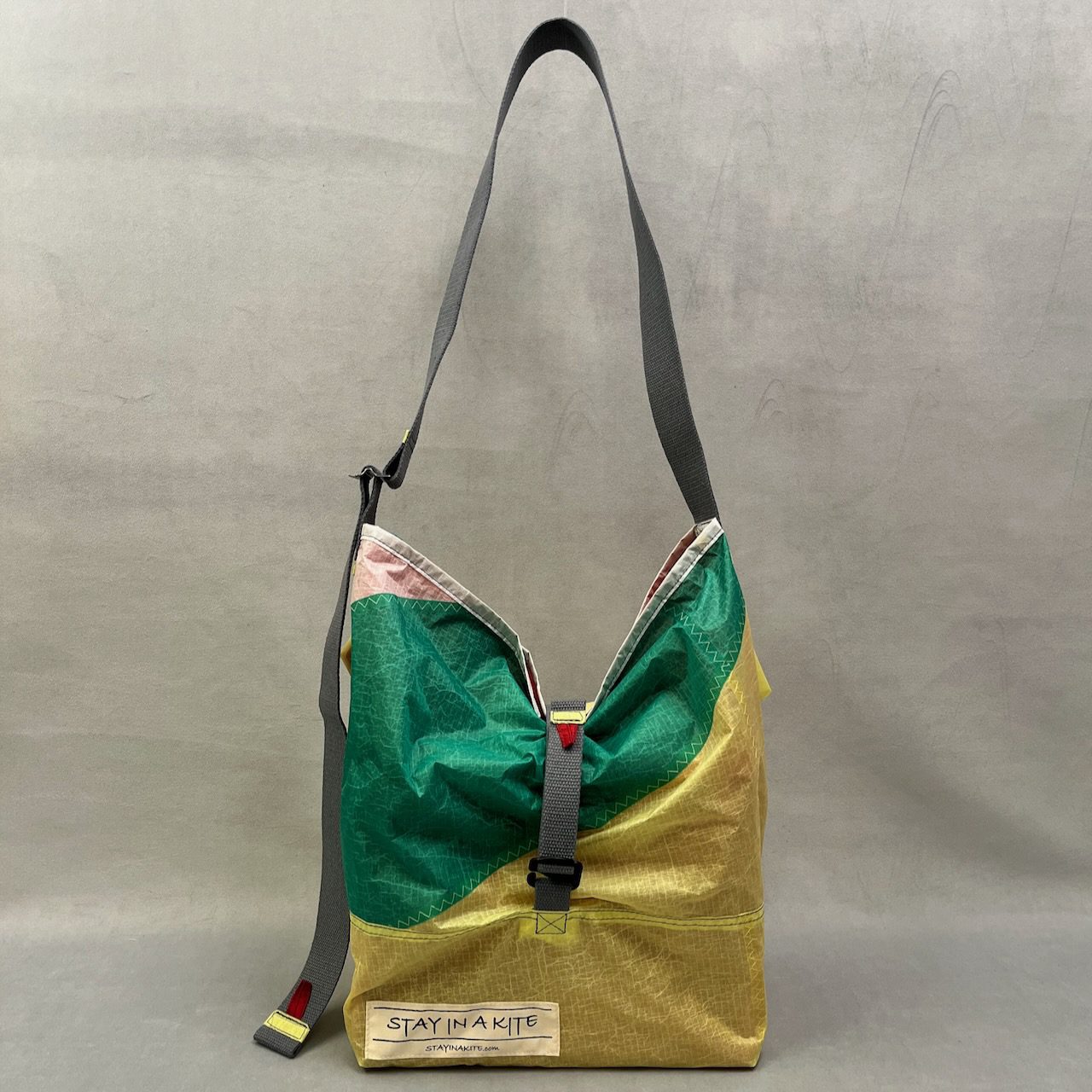 Umweltfreundliche und nachhaltige Upcycling Tasche aus recyceltem Material. Jede dieser extrem leichten, handgefertigten Handtaschen wurde aus gebrauchten Kite-Surf-Segeln hergestellt.ย