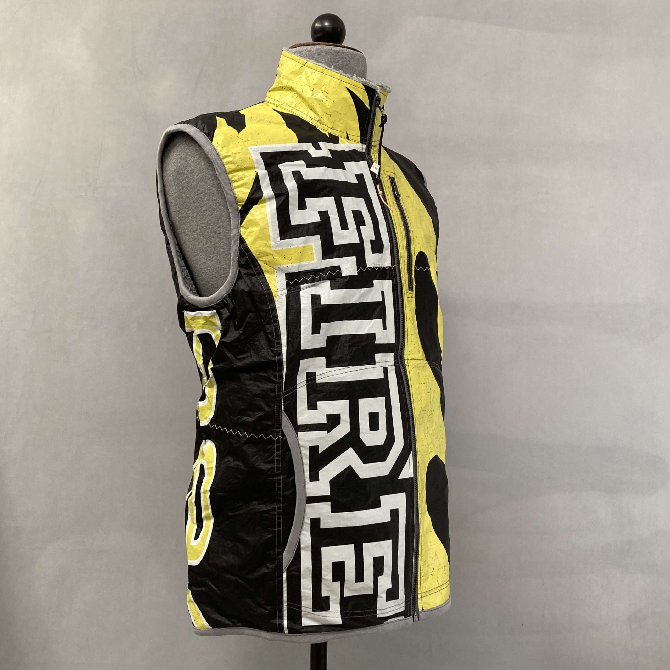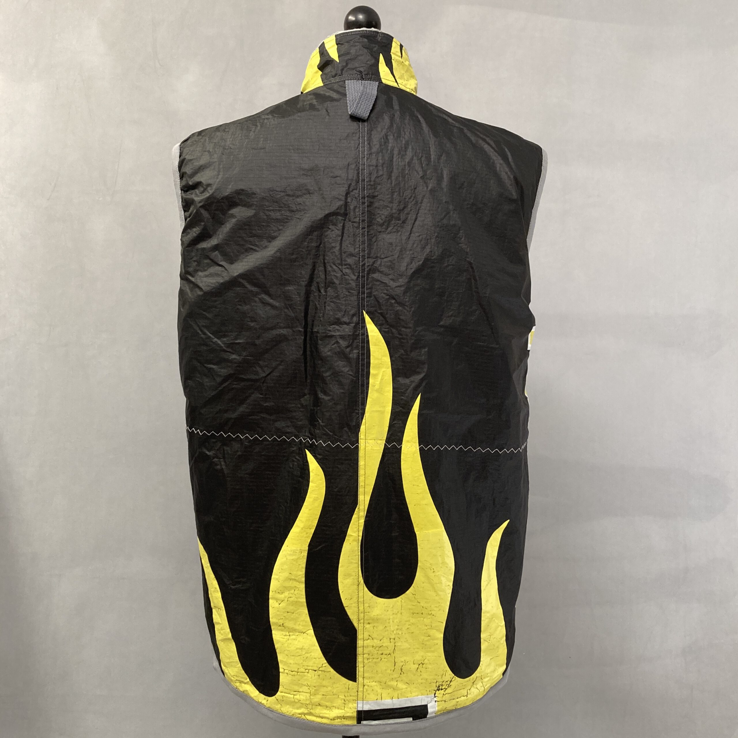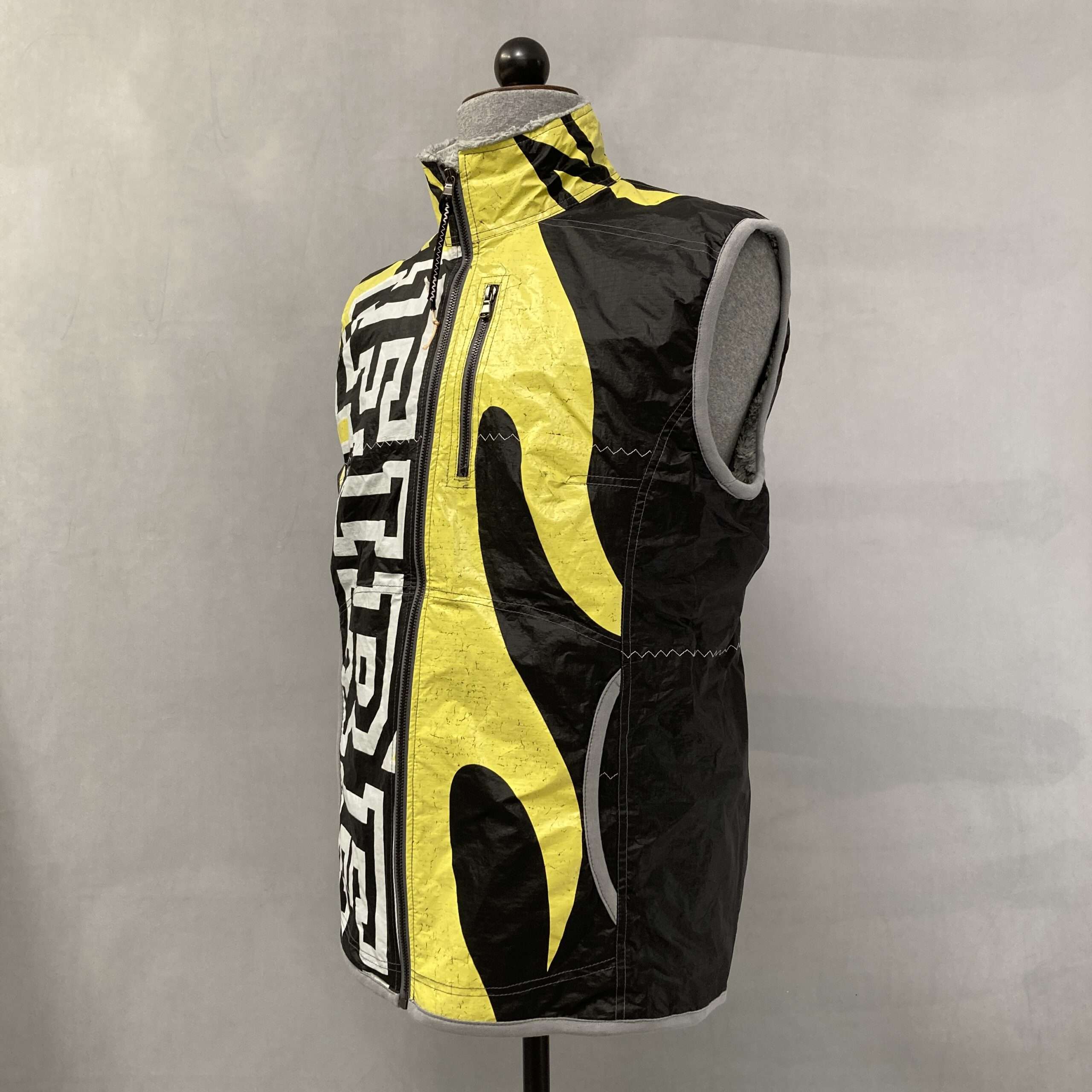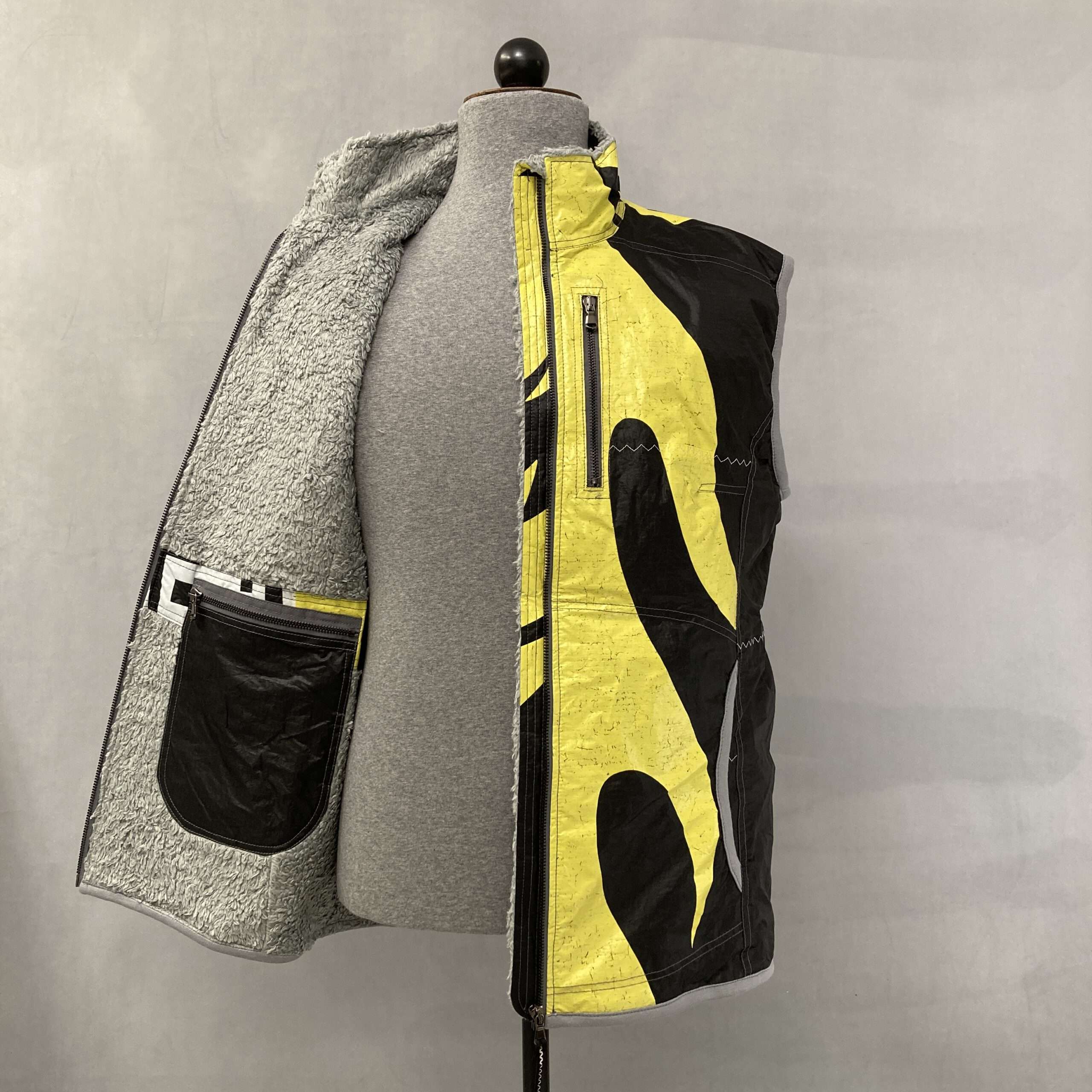 Eine Upcycling-Weste, die gleich zweimal Mรผll vermeidet: Wir verarbeiten gebrauchte Kites und unser Zero-Waste-Anspruch lรคsst uns ihren Verschnitt in unseren anderen Produkten weiter verwenden.