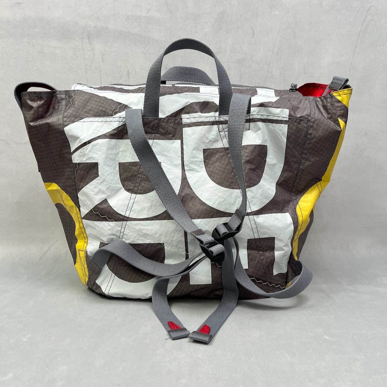 Die FamilyBag SMALL ist kaschiert, besteht also aus mehreren Lagen Segeltuchs, die miteinander vernรคht wurden. Dadurch ist die Tasche sehr stabil und trotzdem extrem leicht und natรผrlich wasserabweisend – so wie das recycelte Material, aus dem sie gemacht ist. Sie ist bestens geeignet als Sporttasche, als Tasche fรผr den Strand, als Tasche fรผr den Wochenendausflug oder einfach mal als Saunatasche.ย
